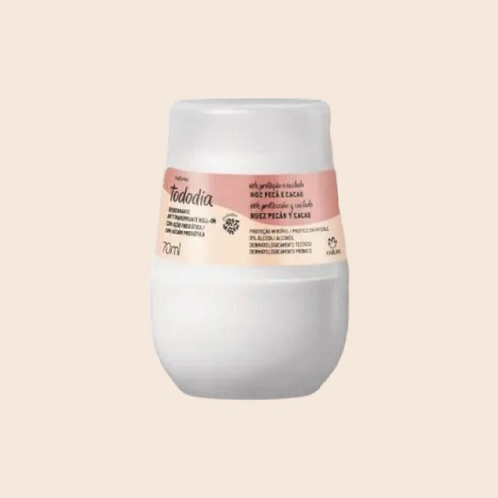 Proteção eficaz e fragrância confortável para o seu dia a dia. O Desodorante Rollon Antitranspirante Noz Pecã e Cacau TodoDia 70ml, da linha Natura TodoDia, oferece 48 horas de proteção contra o suor e os odores, enquanto cuida delicadamente da sua pele. Ideal para quem busca praticidade, cuidado e uma fragrância aconchegante.